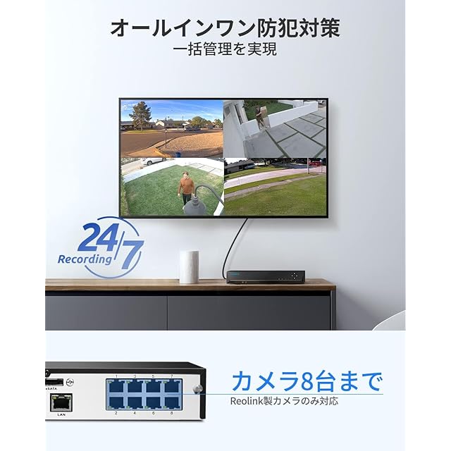 Reolinkカメラ専用:すべてのReolink PoEおよびWiFiカメラ(12MP/4K 8MP/5MP)、部分バッテリーWiFiカメラと完璧に連携します。RLC-510A, 810A, 820A, 811A, 823S1,Duo 2 PoE, 510WA, Lumus, E1 Outdoor, E1 Zoom, E1 Pro, Reolink Doorbell PoE/WiFi, Argus PT Ultra, Arqus 3 Ultra, Arqus 4 Proなどに対応。最大8台のカメラを同時に簡単に管理できます。(ご注意:楽天モバイルに対応しておりません)