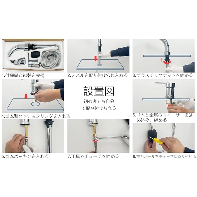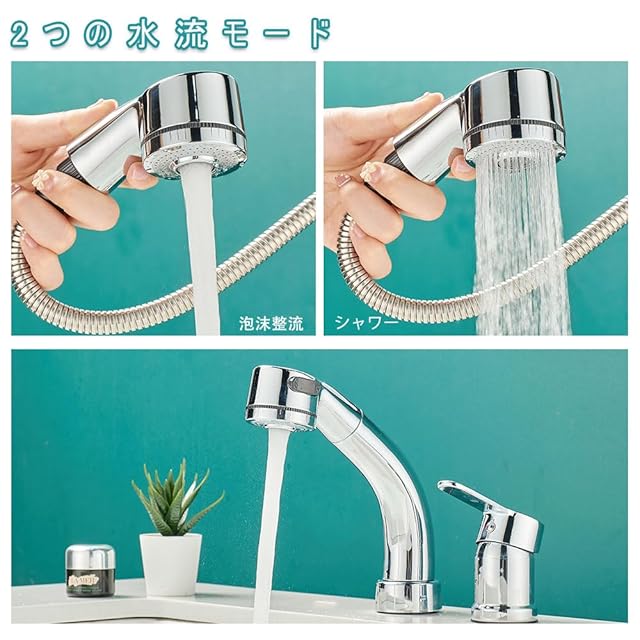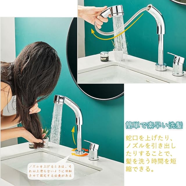 ホース引き出し式、吐水口昇降、360°回転: ホース引き出し最大長さ約55 cm、吐水口昇降最大高さ約14 cm、360°自由に引き出せるノズルは、洗髪にとても便利です