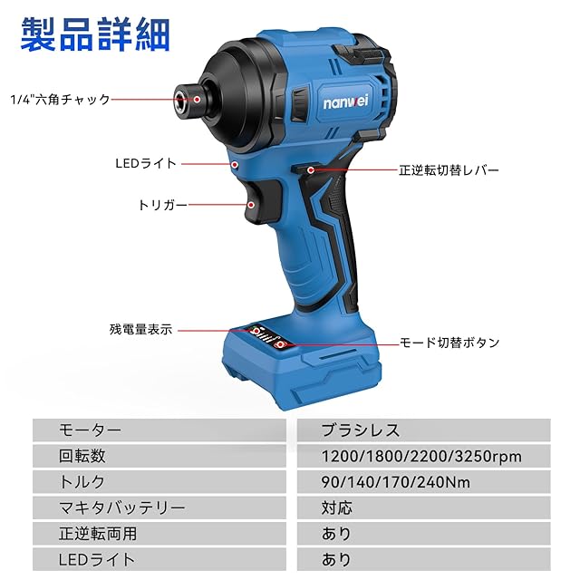 NANWEI インパクトドライバー マキタ18Vバッテリー対応 電動インパクトドライバー 1/4インチ 最大トルク240N·m ブラシレスモーター 4段出力モード 無段変速 高回転 コードレス 小型軽量 LEDライト付き 充電式 本体のみ 【バッテリー・充電器別売り】