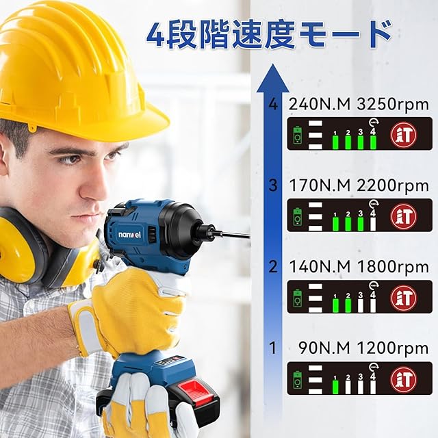 【正回転&4段出力モード】このインパクトドライバーは90/140/170/240N·mの4モードがあります。ワンタッチで正逆転を切り替えでき、トリガーを握る力の強弱で無段変速も搭載されています。