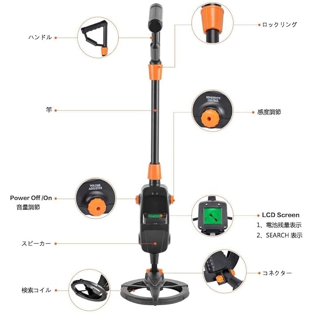 【検知表示】:金属の検出を示す音声アラートとLCDディスプレイ。防水サーチコイル-防水サーチコイルを備えた浅瀬で金属探知機を使用できます。製品は、1つの9Vバッテリーを使用するだけで動作します。長時間動作しなくなった場合は、バッテリーを取り外してください。