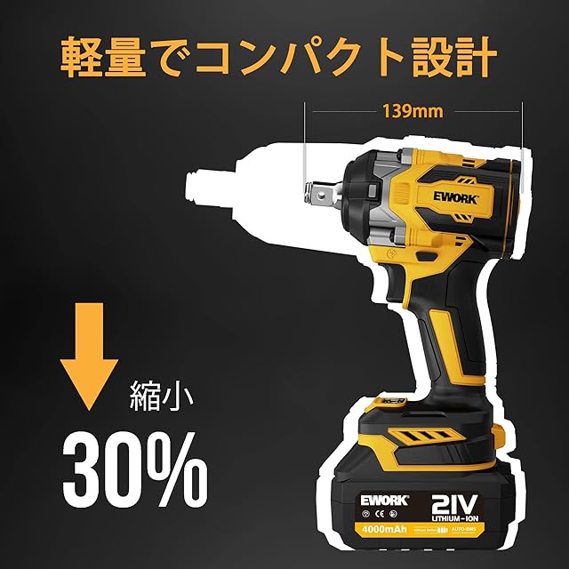 ✅充電式インパクトレンチコンパクト設計、人間工学に基づいたサイズわずか139mm、小型軽量、重さわずか1.46kg(電池含まず)、狭いスペースで操作しやすく、無駄な作業を軽減することが可能です