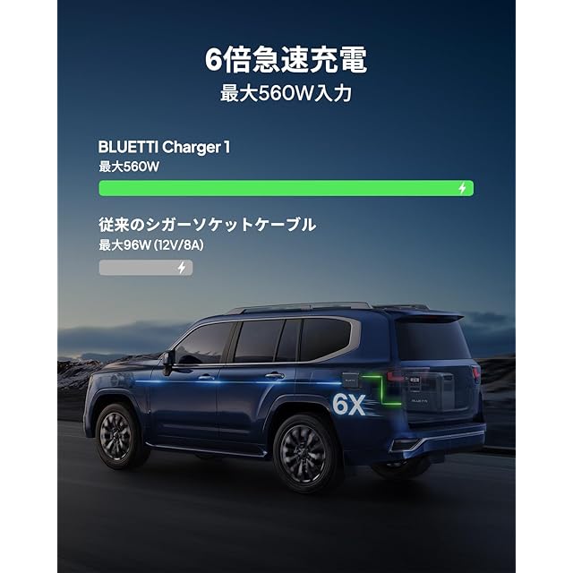BLUETTI Charger 1 走行充電器 6倍急速充電 BLUETTI全ポータブル電源 他社95%のポータブル電源 適用 最大560W 簡単に取り付け 過熱保護 内蔵ファン 互換性高い 電圧電流自動調整 SUV、キャンピングカーなど対応 オプション品 DC入力ケーブル付き
