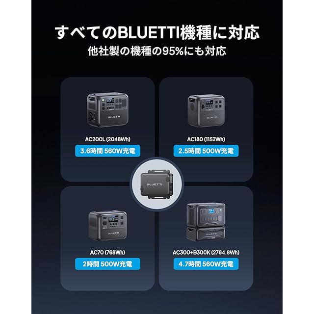 【多種な機種に対応可能・操作簡単】すべてのBLUETTIポータブル電源に対応できるだけではなく、他社製の機種の95%にも対応できます。どこにいても、プラグインして簡単に電源を入れるだけで最高の電圧管理体験をお楽しみください。