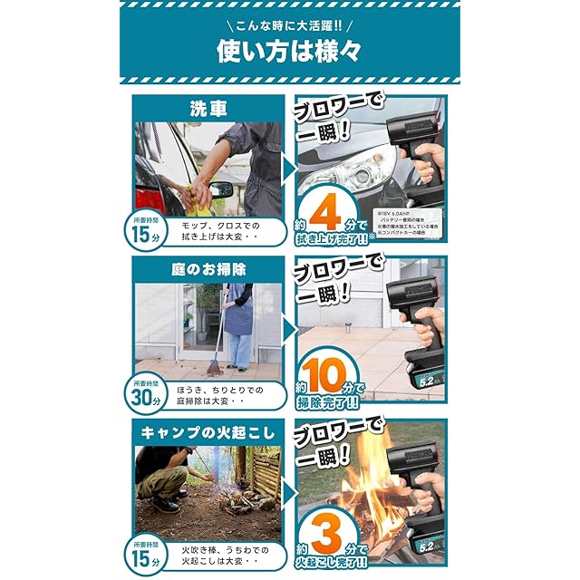 【洗車以外にも様々な用途に】キャンプに持っていけば炭火起こしの強力な味方になります(風量には注意…)また、落ち葉の掃除や家の外壁の掃除などガーデニングやお掃除の場面で幅広く活躍すること間違いありません。車の車内もドアを開けておいて一吹きすればゴミやホコリなどは一瞬できれいになります。