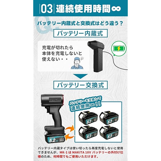 【MAKITAバッテリー対応】本製品は18Vのマキタバッテリーで駆動します。純正のバッテリーはもちろんのこと、当店の各種互換バッテリーでも使うことができるので、MAKITAの掃除機や工具などをお使いの方ならすぐにご使用いただけます。