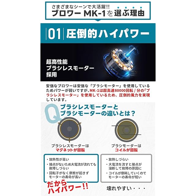 【80000回転/分の超高速ブラシレスモーター】超高回転のモーターが圧倒的な風力を生み出します。台風のような暴風で一瞬で水滴が弾け飛んで乾いてしまうので、洗車の時に拭き上げが一切必要ありません。時間短縮&ラクラクであなたの洗車が変わります!