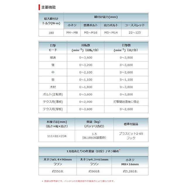 直流18V、スライド式Li-ionバッテリ仕様。バッテリ・充電器別売。締付け能力:小ネジM4~M8/普通ボルトM5~M16/高力ボルトM5~M14/コーススレッド22~125mm。最大締付けトルク:180N・m。回転数[回転/分]:最速 0~3,600/強 0~3,200/中 0~2,100/弱 0~1,100。楽らくモード回転数[回転/分]:木材 0~1,800/ボルト 0~3,600/テクス薄板 0~2,900/テクス厚板 0~3,600。打撃数[回/分]:最速 0~3,800強 0~3,600中 0~2,600弱 0~1,100。楽らくモード打撃数[回/分]:木材 0~3,800/ボルト 0~3,800/テクス薄板 打撃開始直後に停止/テクス厚板 0~2,600。1充電作業量(木ネジ 材料ラワンφ4.3×65mm目安):約960本