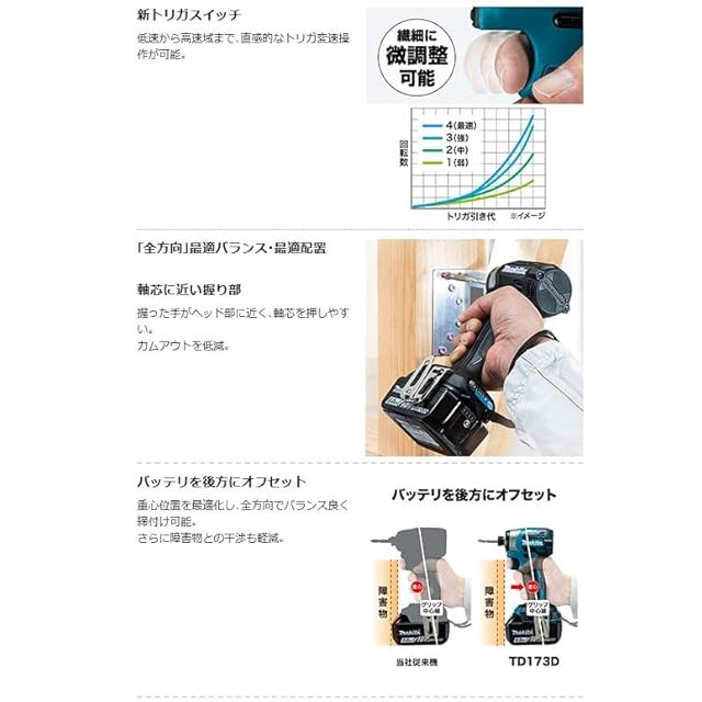 新トリガスイッチ。低速から高速域まで、直感的なトリガ変速操作が可能。軸芯に近い握り部。握った手がヘッド部に近く、軸芯を押しやすい。カムアウトを低減。バッテリを後方にオフセット。重心位置を最適化し、全方向でバランス良く締付け可能。さらに障害物との干渉も軽減。「後方」配置で見やすく使いやすい操作パネル。握ったままでモード操作やバッテリの残容量も確認可能。