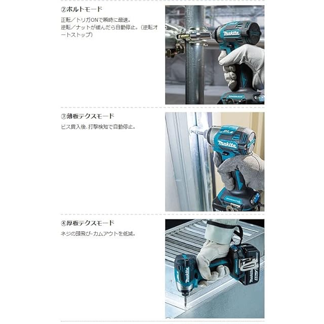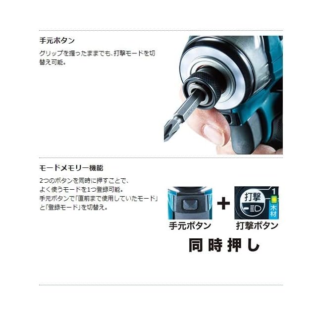 ビット振れ「業界最小」、ダブルボールベアリング採用。新形状ビットスリーブ。縁にリブを設け、スリーブが部材に当たっても傷つけにくい。※国内充電式インパクトドライバにおいて。2022年12月、マキタ調べ。傾き角度約10.5°。優れた隅打ち性能でカムアウトを低減。壁際の作業も快適。作業に合わせて、最適なモードを選択可能。モードメモリー機能。2つのボタンを同時に押すことで、よく使うモードを1つ登録可能。手元ボタンで「直前まで使用していたモード」と「登録モード」を切替え。