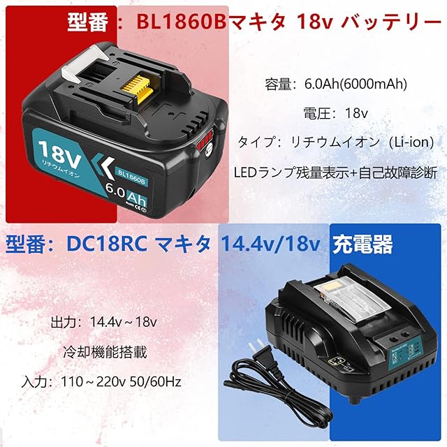 【商品仕様】マキタ 18v バッテリー 充電器セット 型番:マキタ バッテリー 18v BL1860B 電圧:18v 容量:6000mAh 種類:リチウムイオン電池 個数:1個 マキタ 18v 充電器 DC18RC付き AC100v-220v LEDランプ残量表示+自己故障診断、PSE&CEマーク取得済み 高品質採用 着脱方式:スライド式 安定性に定評の高品質モデル、A+ グレードの高品質なセルを採用し、6.0Ahの高容量アップなので、電動工具が長い時間作業できます。