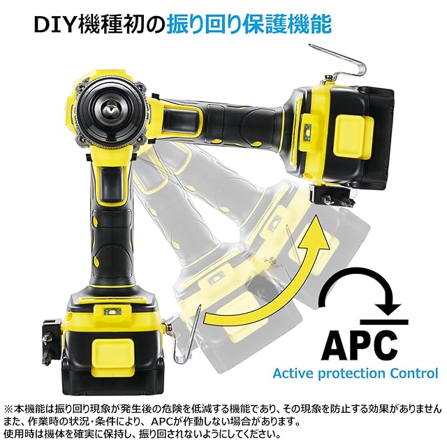【安全性】DIY業界初の振り回る保護機能(APC機能)搭載。中にジャイロセンサーが内蔵し、工具本体が不意に旋回される動作が検知でき、0.5s以内に電源を自動的にカットオフします。※本機能は振り回る現象が発生後の危険を低減する機能であり、防止する効果がありませんので、ご注意くだい。