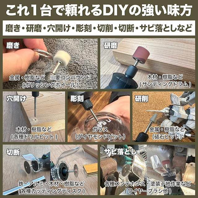 【豊富なツールで幅広い用途に対応】使用頻度の高い148個の高品質なツールがセットとなっており、研磨、穴あけ、サビ落とし、ガラス彫刻、陶芸彫刻、木材加工、金属加工など様々な作業に手軽にご使用いただけます。