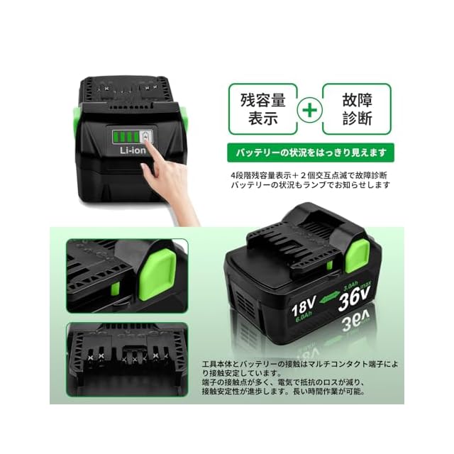 【LED残量表示+故障診断】HiKOKI 36v バッテリー の 状況もランブでお知らせ!残容量表示+自己故障診断、残量表示 バッテリーにボタンがついているのでボタンを押すだけでその場で確認ができます。 残量確認が素早くできるので便利です。 自己故障診断 同じくボタンを押すだけでバッテリーが故障を教えてくれます。
