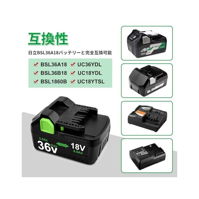 【圧倒的なパワー】 ハイコーキ バッテリー は HiKOKI/日立工機の36Vマルチボルトシリーズと従来の18V製品を互換できます。純正充電器対応。※電池装着で自動切替、従来の36v製品(BSL3620、BSL3626、BSL3660対応製品)にはご使用になれません。