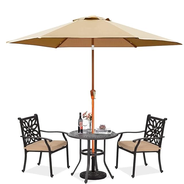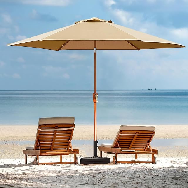 【幅広い適用範囲】:木目調中柱ガーデンパラソル、屋外の庭園、露天カフェ、レストラン、公園など、さまざまな場所に適用されます。商業施設や家庭でのレジャーにおいても、快適な日除け環境を提供します。