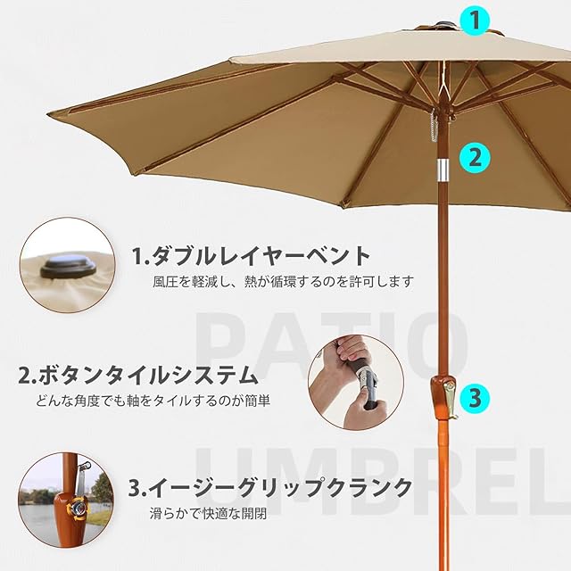 パラソル ガーデンパラソル 風に強い 大型 直径270cm UVカット 撥水加工 角度調節 チルト機能付/クランク開閉 丈夫 日除け アウトドアの庭園、露天カフェ、レストラン、公園など、さまざまな場所に適用されます (270cm, カーキ)