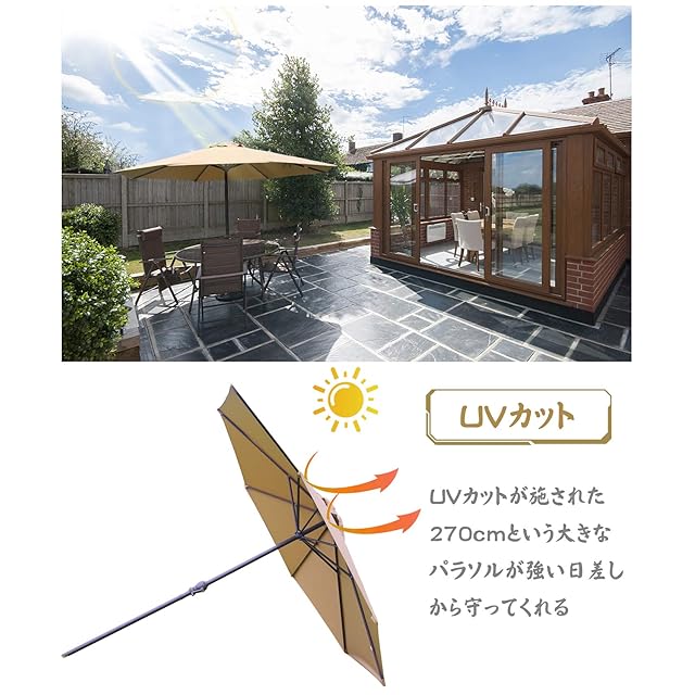 uvカット:UVカットが施された270cmという大型パラソルが強い日差しから守ってくれるので、直射日光を気にせず快適にガーデンライフを楽しんでいただけます