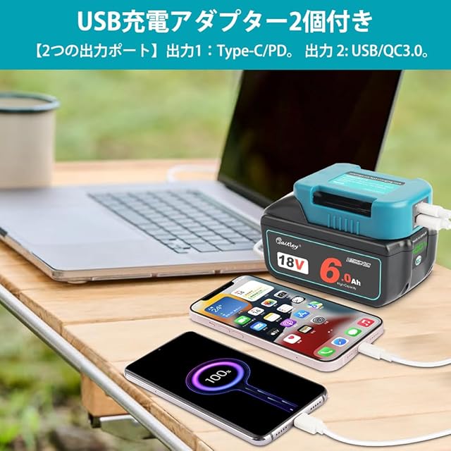 本製品デザインメリット:USBホルダー Type-C高速充電付き、マキタ18Vバッテリーを使用して、AC電源がない場所でも、スマートフォン、などのUSBデバイスを充電することができます。また、ベルトに装着して歩きながら充電することもできます。バッテリーの残量が100%で表示されるため、バッテリーの使用状況や交換のタイミングが一目で分かります。これにより、作業の途中でバッテリー切れを防ぎ、計画的な作業が可能となります。