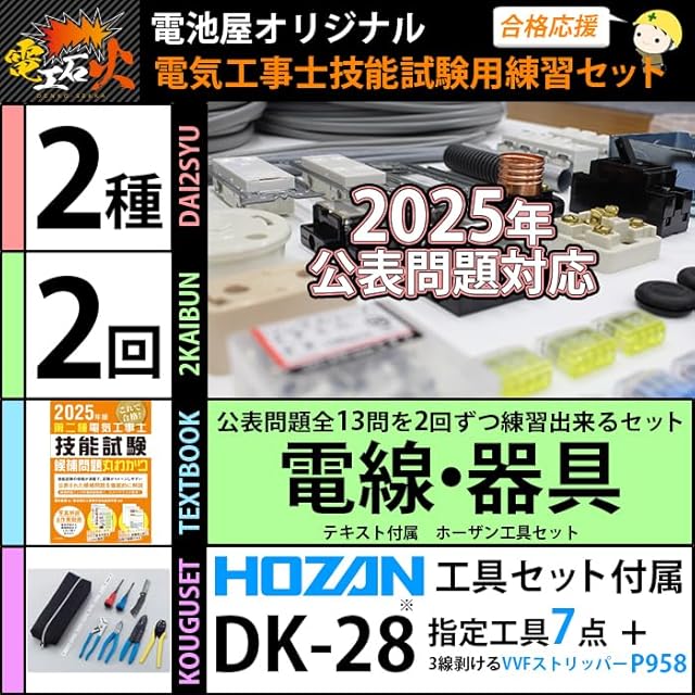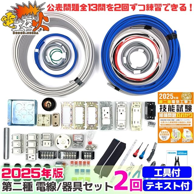 電気工事士2種技能試験セット【2回練習分】(電線、器具、ホーザン工具、テキスト) 【全13問対応】第二種電気工事士 (2025年版)【電工石火シリーズ】