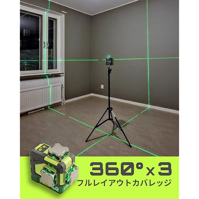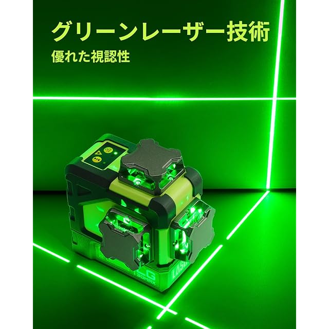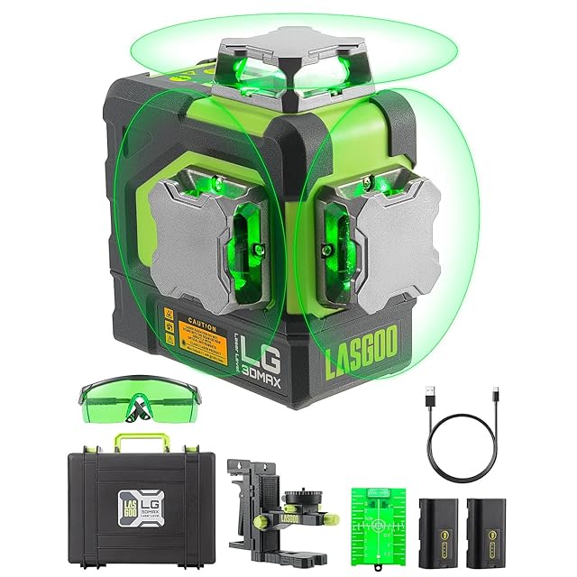 LasGoo LG-3DMAX 3x360° グリーンレーザーレベル、3D 自動水平調整クロスラインレーザー、2つの充電式リチウムバッテリー、微調整ブラケットアダプター、グリーンレーザー強化メガネ、ハードキャリングケース