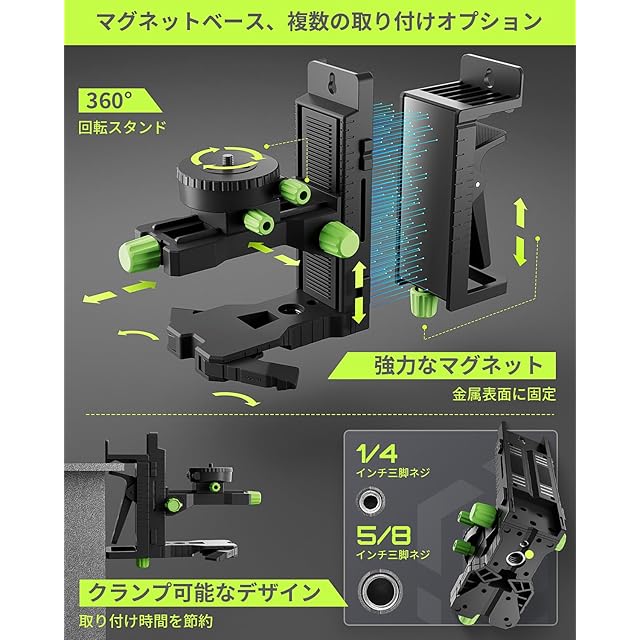実用的なデザインとプロフェッショナルなマグネットブラケット:LasGoo LG-3DMAXは、底部に1/4"-20および5/8"-11の取り付けネジを備えており、さまざまな三脚仕様に適合します。付属の微調整ブラケットアダプターは、さまざまな複雑な作業環境に対応します。その安定したデザインにより、使用中の移動や揺れが減少し、レーザーの微調整が可能で精度が向上します