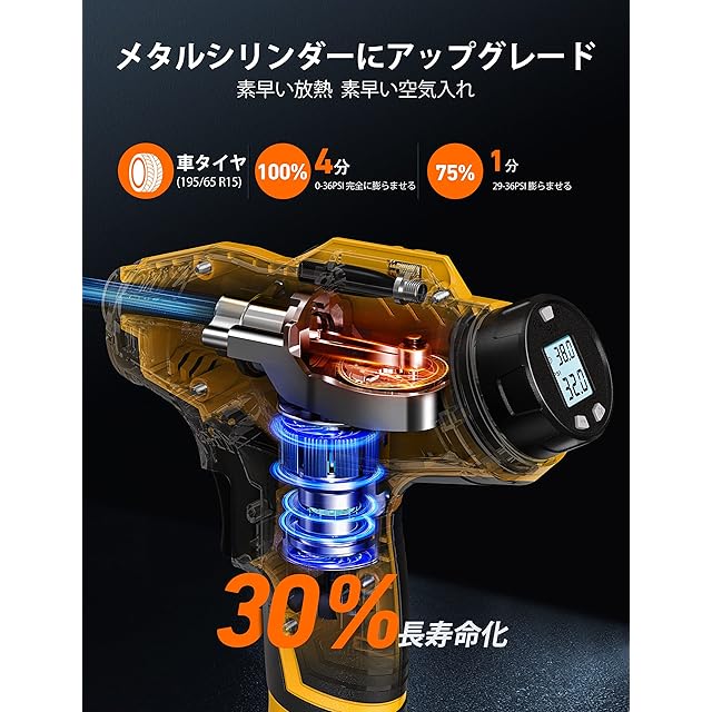 【内部金属気筒、耐久性抜群!】金属気筒は頑丈で耐久性があり、熱放散を促進し、より強力なパワー、より長い耐用年数、より速い充填効率。底部は安定していて置きやすい。DC12Vベースとリチウム電池ベースは、付属のバックにエアポンプと一緒に保管できます。