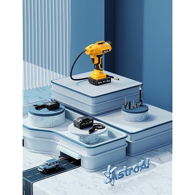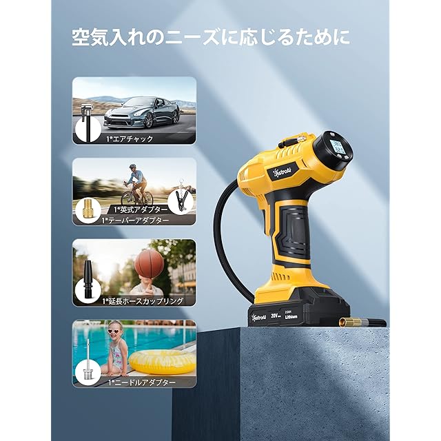 AstroAI エアホークプロ 電動エアコンプレッサー コードレス20V 充電式エアコンプレッサー 電動空気入れ 共通バッテリー付き ボール 自動車 自転車 トラック バイク 浮き輪適用 充電式 バッテリー LEDライト付き 日本語取扱説明書付き イエロー
