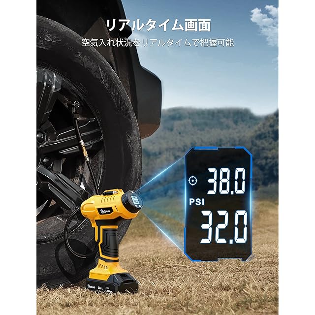 【操作簡単、日常の空気入れない悩みを解除!】本品はダイヤの気圧を自動的に検知できます。事前に設定した数値まで達すると自動停止する機能付きます。いい見た目のLCDスクリーンは設定気圧とタイヤの気圧値が表示されます。3種の空気圧単位 BAR /KPA/ PSIを切り替えることができます。SUV、自動車、オートバイ、自転車、浮き輪、バスケットボールなどの空気を入れる物に対応可能です。日常生活やアウトドアレジャーに最適!