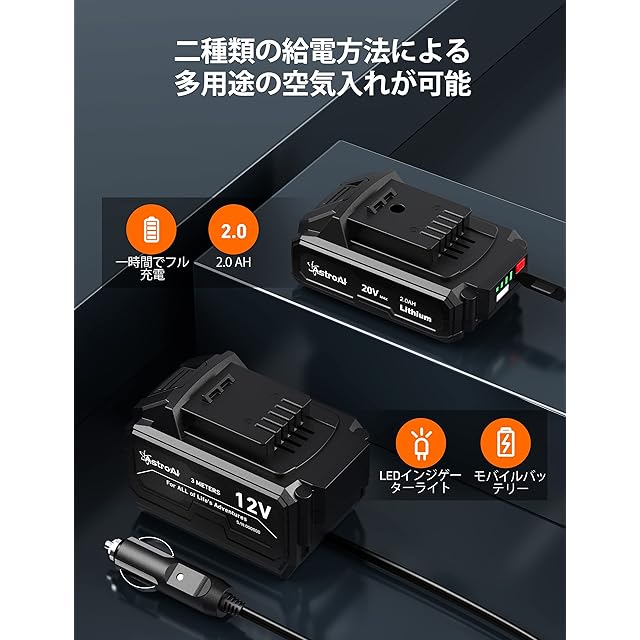 【LEDライト付き、充電が便利!】このエアーコンプレッサーはLEDライトを搭載していて、電源が接続されると点灯します。照明がない夜道や視界の悪い場所でも作業が可能です。また、3メートル長さのDC12Vプラグ+専用USB充電式バッテリー2つの電力供給方式を対応します。