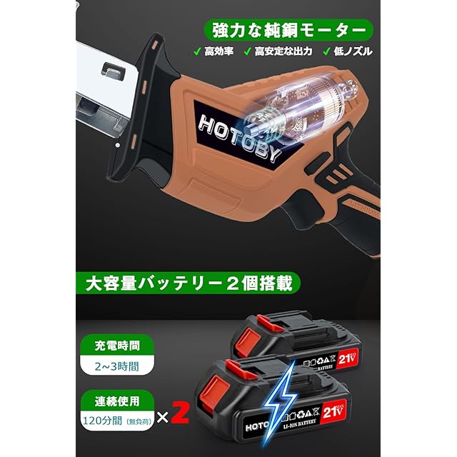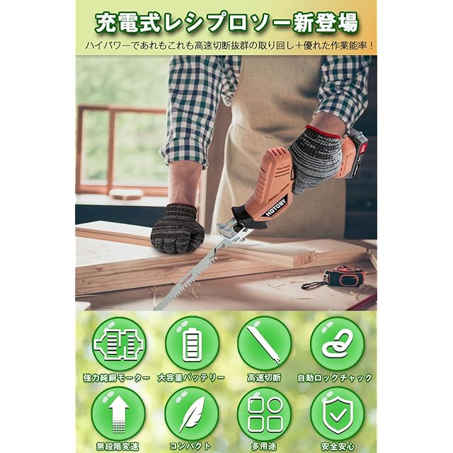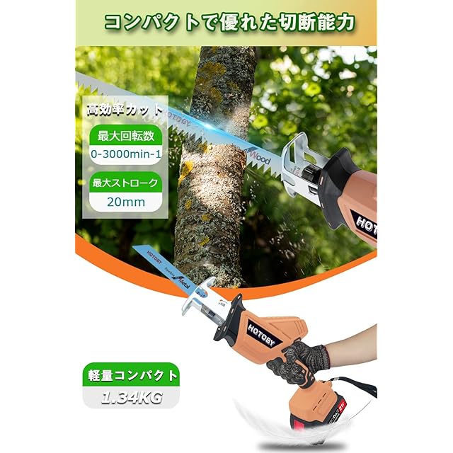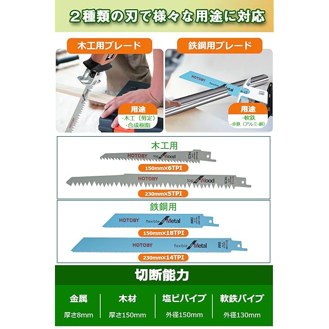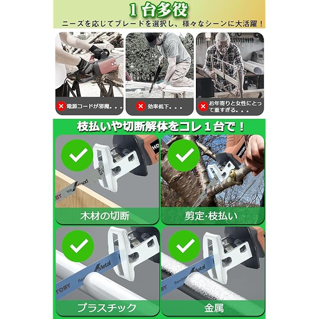 【安心なサポート、2種類の刃で様々な用途に対応!】 高品質の木工用と鋼鉄用ブレードを2種類ご用意しております(総計8本)。ニーズに応じ、ブレードを選択でき、様々な用途に対応できます。庭木の枝打ち、枝の剪定や木材、金属、プラスチック製パイプなどの切断、粗大ゴミ解体をコレ1台で十分!安心なサポートも付いています。本製品は購入日より半年の保証期間があります。万が一商品に何か不具合または質問があったら、説明書に記載されている連絡先にお気軽にご連絡ください。お客様は満足できるよう全力を尽くしていきます。