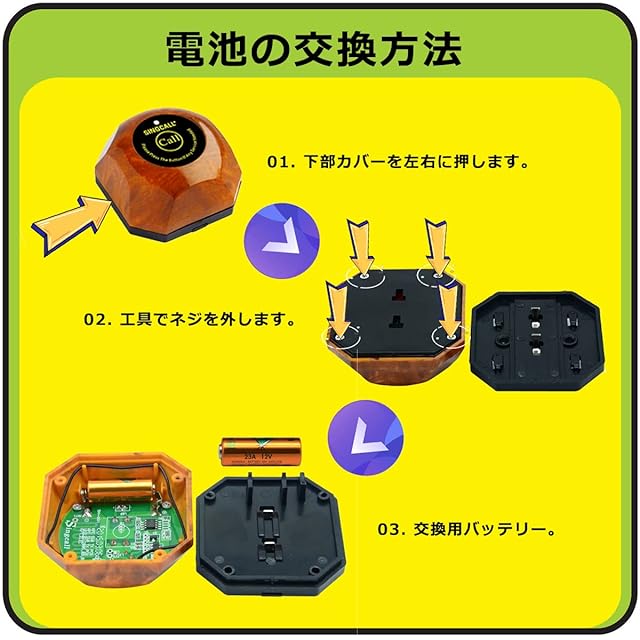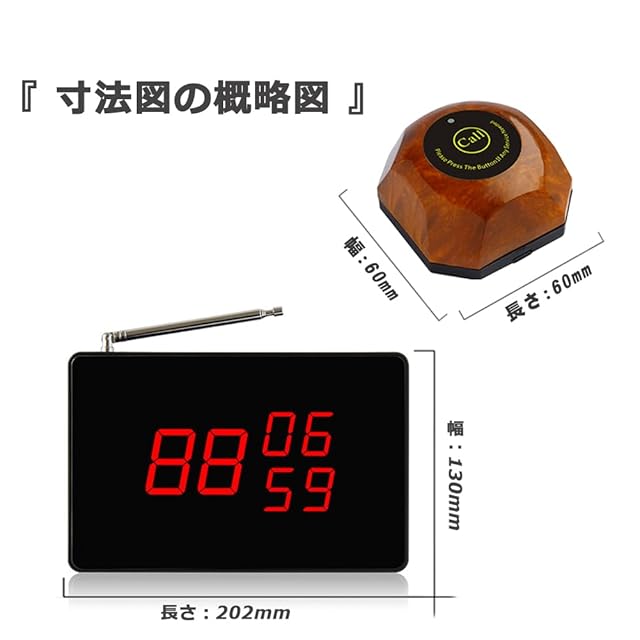 『使用場所』レストランや居酒屋、喫茶店など、商業施設での呼び出しベル、病院や介護施設で使用。におけるお客様からのスタッフ呼び出しに。自宅の老人や子供部屋の呼び出しベルワイヤレスで使用。介護施設でのお客様からの呼び出しに、病院でのナースコールに。