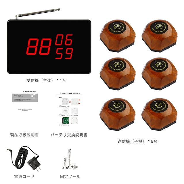 呼び鈴 ワイヤレス受信機本体(ACアダプタ付)+送信子機6台、電源コードとプラグ、日本語説明書。