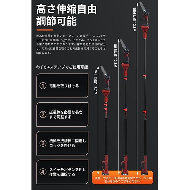 【多重安全保護機能の搭載】:高枝切り電動チェーンソーには、二重ロックシステムが備わっており、誤操作を防止します。高枝ポールには、意図しない落下を防ぐ安全装置が装備されています。この高枝切り電動チェーンソーの使用では、安全が常に最優先されます。