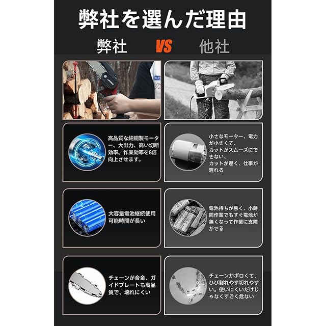 【パッケージ内容とご注意事項】:[パッケージ内容] 1 x 電動チェーンソー、1 x 伸縮延長ポール、2 x大容量バッテリー、1 x 充電器、1 x 取扱説明書、1 x 安全眼鏡、1 x 予備のチェーン、2 x ドライバー、1 x 作業用手袋。電池の過放電を防ぐため、少なくとも月に1回は電池を充電してください。製品に初期の欠陥があるか、通常の使用中に故障が発生した場合は、販売業者にご連絡ください。お問い合わせは24時間以内に返信されます。【お問い合わせ方法】:「アカウントサービス」にアクセスし、[アカウントサービス]→[注文履歴]→[注文番号]→[販売者]→[質問をする]。