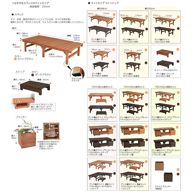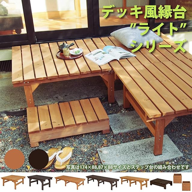 天然木無垢材を贅沢に使用し、しっかりした造りが好評のロングセラー商品、デッキ風縁台シリーズに弟分のライト/コンパクトシリーズが登場!ライトブラウンとダークブラウンの2色展開、サイズバリエーションも豊富でステップ台や専用ウッドプランター、お得なセット商品もご用意。縁側や、ちょっとしたスペースのベンチ、ウッドデッキ風の広い縁台まで様々な設置が可能です。販売中のシリーズ商品は[サイズ][カラー]メニューよりお選びください。