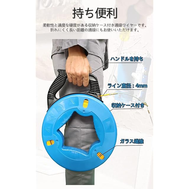 Leyicy 通線ワイヤー 60m 通線収納ケース付け スチールワイヤー 通線工具 屋根裏などに配線、通線、入線専用ツイスト形状のワイヤー 【4mm*60m】