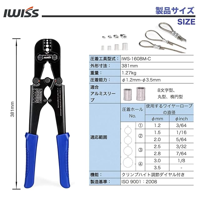 アイウィス(IWISS) オーバルスリーブ ワイヤーロープ ワイヤーロープカッター機能装備 アルミスリーブ かしめ機 圧着 切断 1丁2役!φ1.2mm-φ3.5mm圧着 IWS-1608M-C