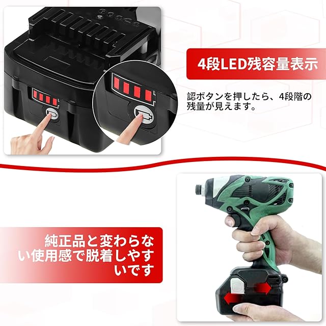 【残容量表示】:残容量表示+自己故障診断、4段階残容量表示、2個交互点滅で「故障」、バッテリーの状況もランブでお知らせ! ハイコーキ 18v バッテリー:高品質セル搭載、メモリー効果がないため、継ぎ足し充電が可能。寿命特性、充電時間、連続使用時間なども純正品と同レベルで、耐久性が高く、長期間使用可能です。