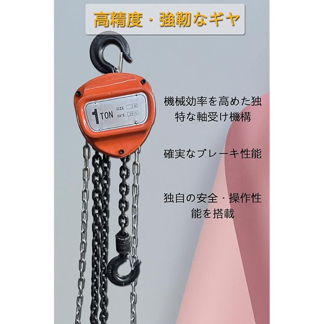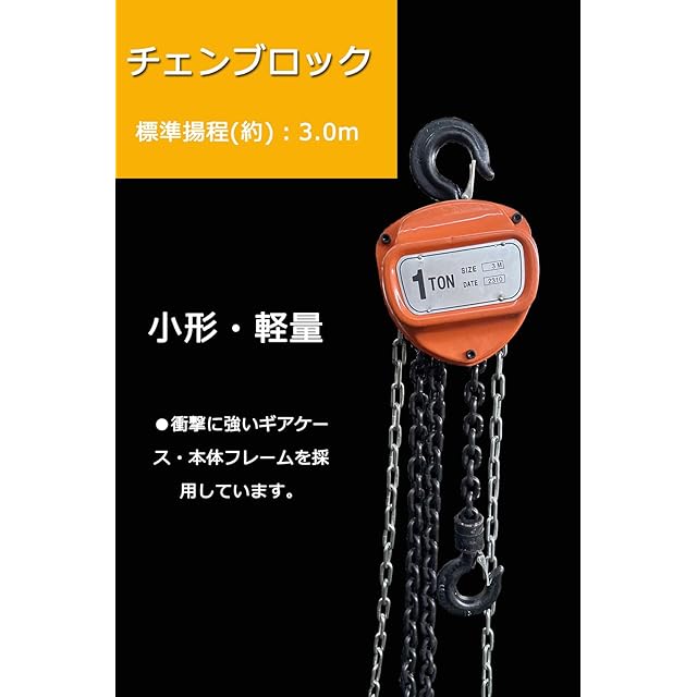 【チェーンブロック】最大吊上荷重:1T、最大巻上長さ:3m、1t巻上時の手引力:304N、最大巻上時のフック間距離:280mm、質量:10kg