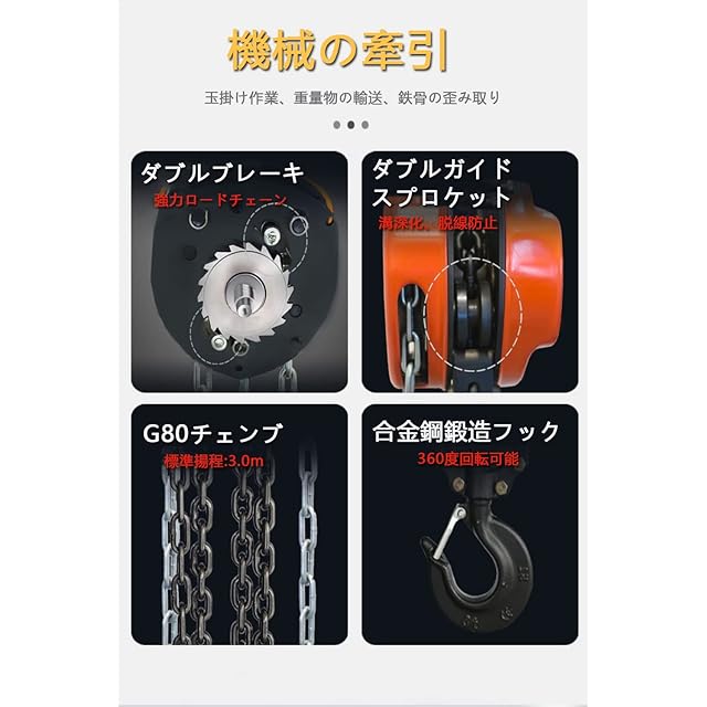 【吊り上げ 1000kg 】チェーンブロックは少ない力で重い荷物や重量物を吊り上げて、操作も簡単で、効率よく作業が行えます。レバーホイストはダブルブレーキ機構を採用し、安全性にも配慮した作りも魅力。