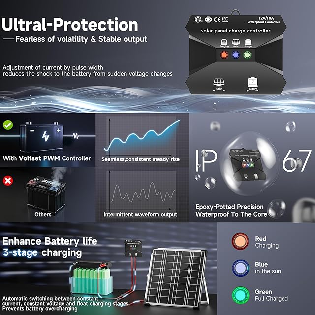 アップグレードされたMPPTコントローラー:メンテナンス付きのインテリジェントMPPT充電コントローラーは、他のソーラー充電コントローラーよりも20%〜30%以上多くの電力を生成します。 10A MPPT 充電コントローラー 100% 防水、完全に水に浸すことができます。 バッテリーを完全に保護し、過充電、過放電、過電圧、過電流、過負荷、短絡、逆極性、過熱を防ぎます。10Aコントローラーはソーラーパネルの最大電力に適しています。 130Wを超えないでください