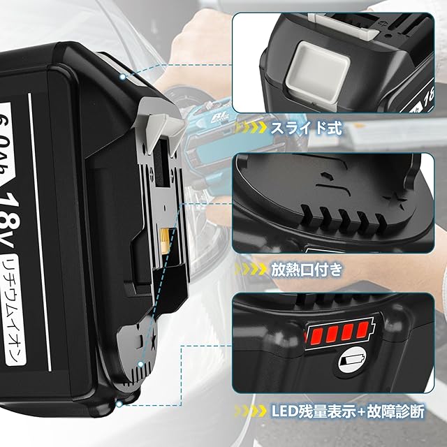 【LED残量表示+故障診断】:互換マキタ18vバッテリーの状況もランブでお知らせ!残容量表示+自己故障診断、 残量表示 バッテリーにボタンがついているのでボタンを押すだけでその場で確認ができます。 残量確認が素早くできるので便利です。 自己故障診断 同じくボタンを押すだけでバッテリーが故障を教えてくれます。