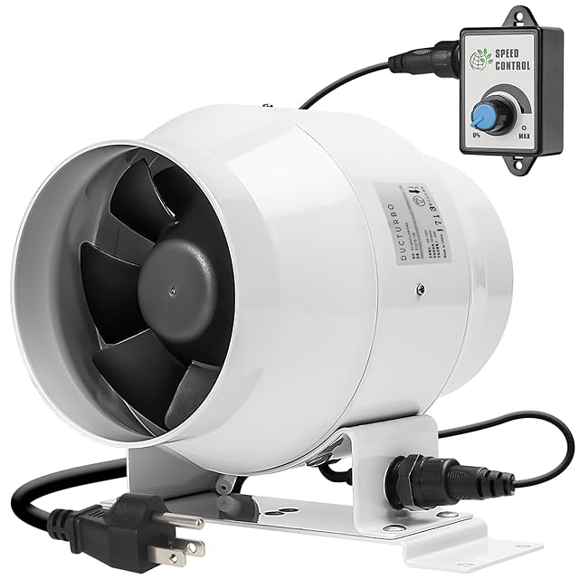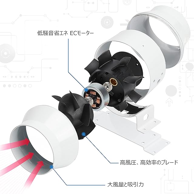 省エネ換気ファン - このインラインダクトファンは無段階可変速度制御器を有し、風量とノイズレベルを0%から100%の範囲で制御可能。本換気ダクトはブラシレスECモーターを採用し、ダクト換気時の消費電力は20W/h。他の同風量の"Amazonで販売されている換気扇と比較し、約2/3の消費電力を実現。おやすみの際はダクトファンの速度を、動作音と振動が発生しないレベルまでコントローラーで下げることが可能。