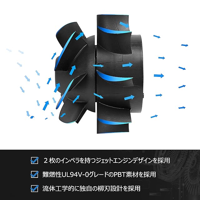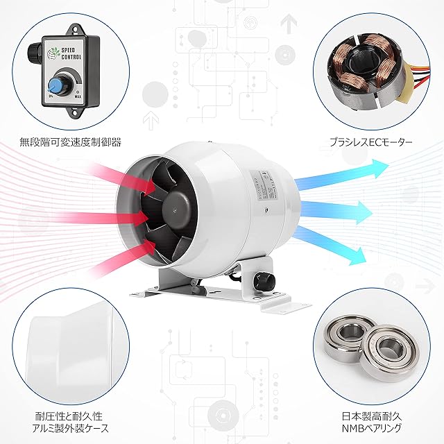 高品質素材 - 外装ケースに耐圧性と耐久性に優れたアルミを採用。軽量化と高耐久化を同時に実現。プラスチック製の換気ファンは容易に壊れ丈夫ではありません。ブースターファンのブレードは難燃性UL94V-0グレードのPBT素材を採用。高速回転でも変形せず運用可能。日本製高耐久NMBベアリングを採用し、軸ブレ防止と長寿命化を実現。