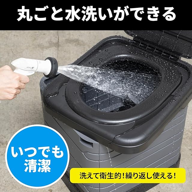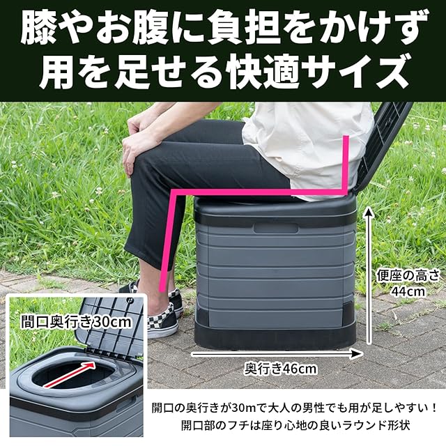 【ポータブルトイレ】簡単に折り畳み、組み立てができるポータブルトイレです。●保管に便利な収納袋を付属しています。●最大荷重は100kgです。体の大きな方でも安心です。●便座の高さが42㎝、開口部の奥行きが30㎝なので脚や腰に負担がかからず楽な姿勢で安心してお使いいただけます。●開口部のフチは座り心地の良いラウンド形状です。●ポータブルトイレとして使用しない時は、コンテナボックス、踏み台、イスなど様々なシーンで活躍します。