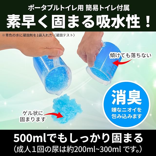 【簡易トイレ】 ●簡易トイレ10回分(排泄袋10枚、凝固剤10個)同梱 ●非常時の水や電気が使えないときにポータブルトイレや家庭用トイレでご使用できます。●凝固剤+消臭効果で排泄物をしっかり固めてニオイを抑えます。●高品質な凝固剤で500mlでもすばやく固めます。●凝固剤は気密性の高い防湿アルミ袋を使用しているので使用期限は15年間です。●排泄袋は丈夫でニオイが漏れにくい高密度ポリエチレン素材です。