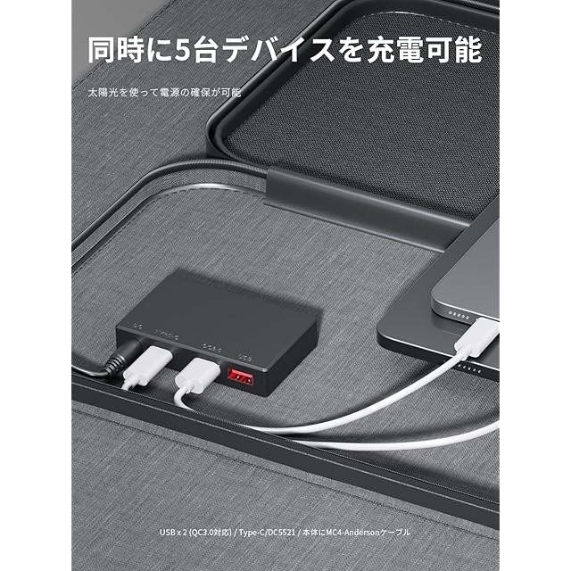 【幅広い互換性 ・ポータブル電源に最適】USB*2(QC3.0対応)+Type-C+DC5521+本体にMC4からXT90/XT60/Anderson 3-in-1ケーブル付属されて、同時に5台デバイスを充電可能です。FOSSiBOT ポータブル電源だけではなく、他社のポータブル電源にも充電できます。高効率により、太陽を最大限に活用し、太陽光を電気エネルギーに変換できます。また、MPPT技術のアルゴリズムを用いて効率性を調整しているため、安定した電力の供給が実現します。緊急時だけでなく、日常生活で使用で、月々の電気使用量を減らす節電にも役立ち、環境にやさしいエコなライフスタイルを実現することができます。