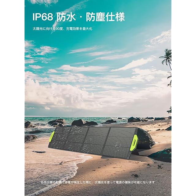 【全環境対応・IP68防水防塵】FOSSiBOT 200W ソーラーパネルは軽量折り畳み式の設計、太陽光を最大限吸収するため展開時の横幅は約2.4mですが、折り畳み時はわずか0.53m、どこでも持ち運び可能です。優れたIP68防水防塵性能を備え、防水性と耐久性が高い素材を採用し、屋外使用に設計され、レザー製のハンドル付きって持ち運びやすいです。 背面収納ポケット付き、付属品に加え、ケーブルなどの小物も収納できます。キャンプ、ハイキング、登山などのアウトドアに最適です。