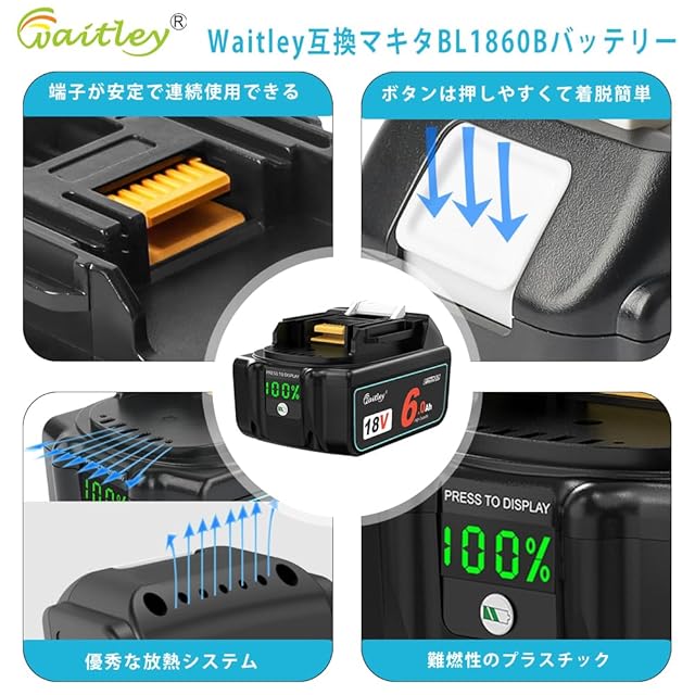 þ〖本製品デザインメリット〗Waitley唯一なデジタル%残量表示で一目瞭然です。小型軽量で簡単に操作できます。難燃性のプラスチックを利用した外殻、耐久性が高く、長期間使用可能です。メモリー効果がないため、継ぎ足し充電が可能。自然放電も少なく仕事率が更にアップなります。